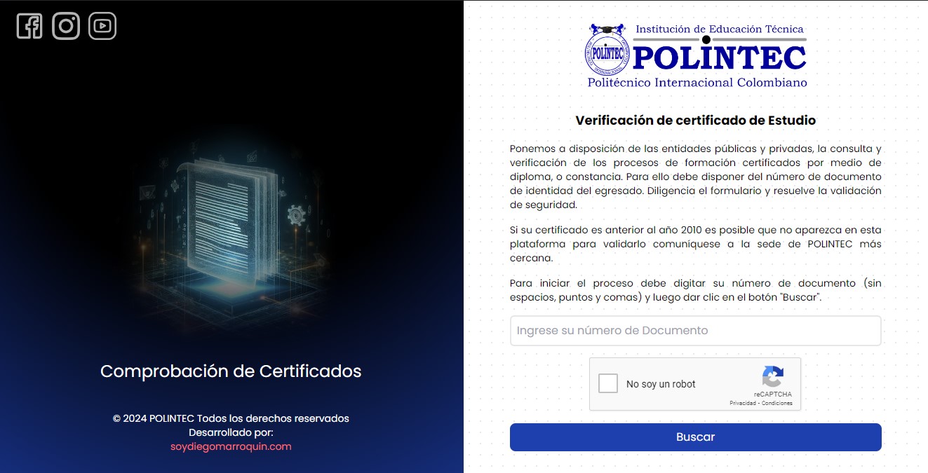 Rediseño y maquetación del sitio web con WordPress, junto con el desarrollo de una aplicación web para verificar si una persona ha estudiado en esta institución. La aplicación permite descargar un PDF como constancia y se puede acceder a ella desde la opción 'Comprobar Certificados' en la página principal.